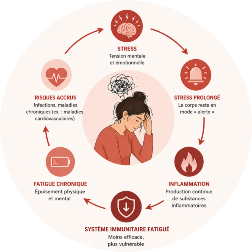 Concrètement, un stress prolongé enclenche une alarme biologique constante. Comme un système de défense qui resterait bloqué en mode « alerte », le corps se met alors à produire en continu des substances inflammatoires.